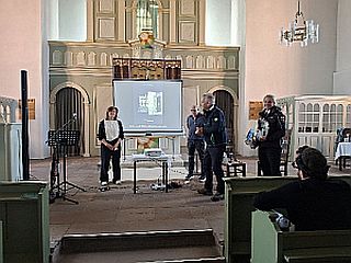 Elfriede und Hans-Jürgen Brumsack (links und rechts der Leinwand), während einer Lesung im Rahmen des Gedenkmarschs 2025 Steps to Remember